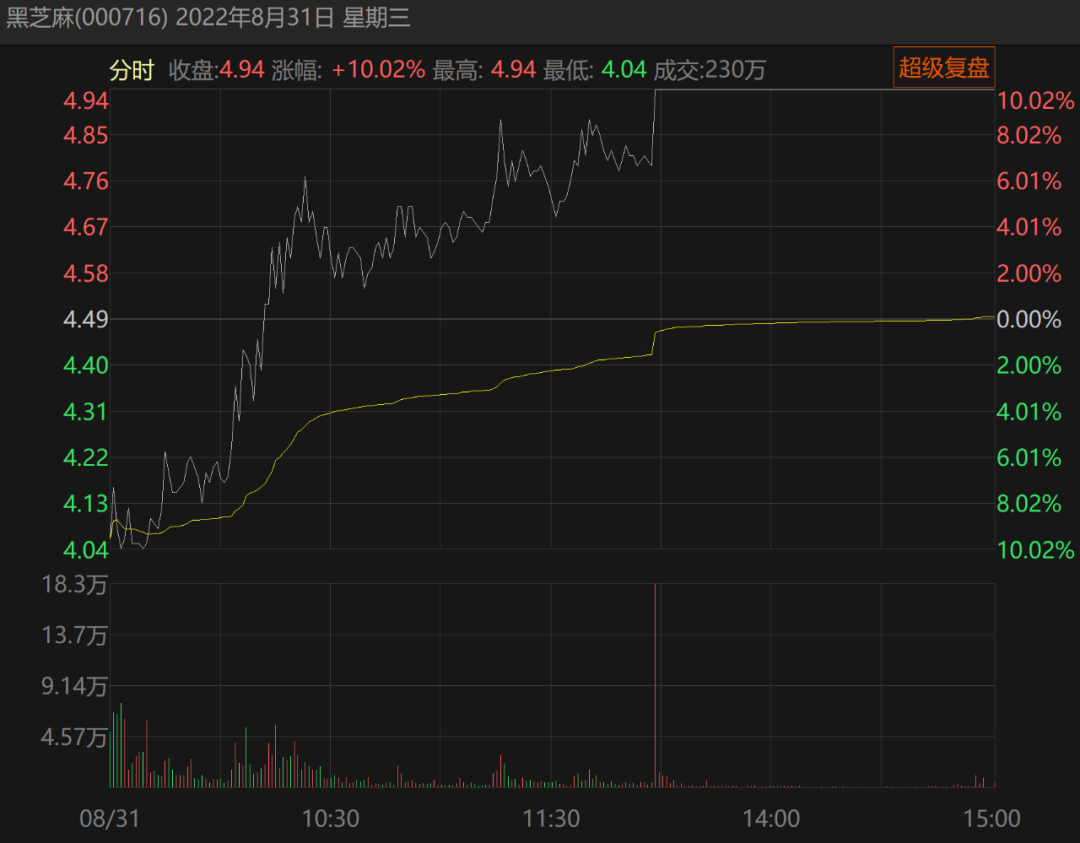 之后的8月29日,黑芝麻涨停;30日,黑芝麻跌停;31日,黑芝麻“地天板”,上午跌停,下午涨停,这下彻底“成妖”!