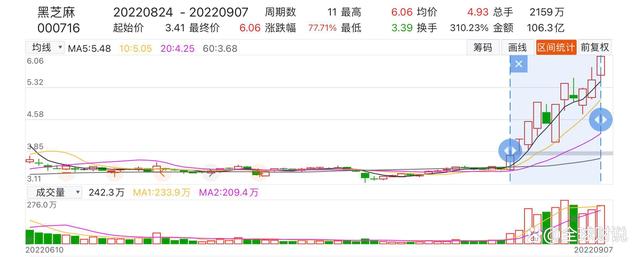 9月7日,食品板块个股黑芝麻再度涨停,报收6.06元/股,自8月24日至今区间涨幅已经接近80%。