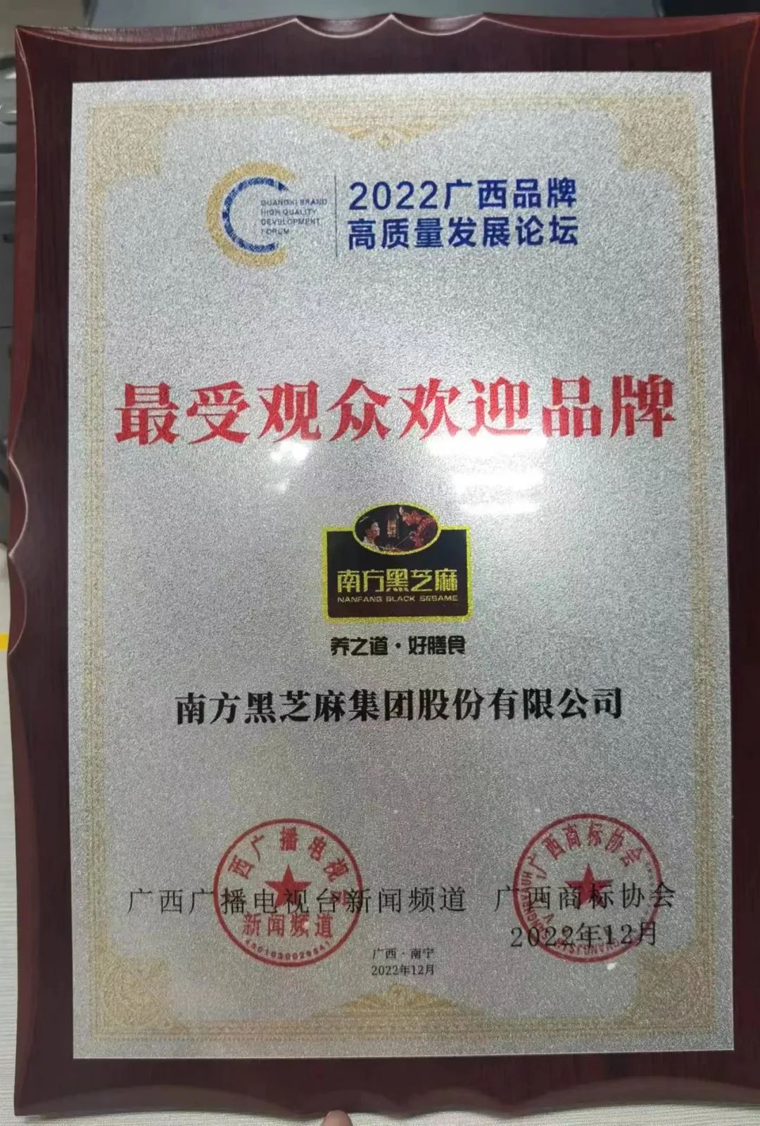 经过初评、专家评审等多个环节,南方黑芝麻以38年的品牌实力,在70多家优秀企业中脱颖而出,荣获2022广西品牌高质量发展论坛组委会评选颁发的“最受观众欢迎品牌”,实至名归!