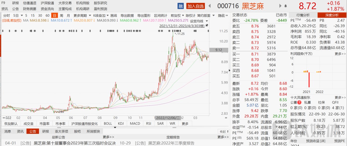 那么黑芝麻股民怎么看?答案是似乎并不看好。公告发布后,黑芝麻二级市场股价表现并不是很强烈,整体只是横盘震荡,截至4月3日收盘,收涨1.87%,股价报收8.72元,总市值64.88亿元。