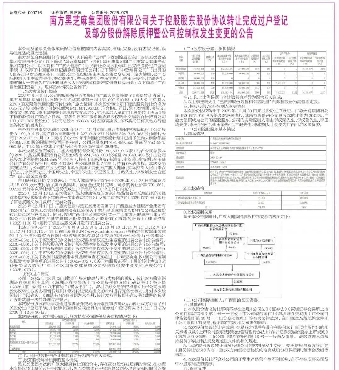 2025年8月,南方黑芝麻原控股股东黑五类集团,以6.25元/股的价格,向广旅大健康转让1.51亿股股份(占总股本20%),总价款9.42亿元(含税)。2026年1月4日,股份过户完成,广旅大健康凭借合计超37%的表决权(含黑五类集团及其关联方放弃的17.66%表决权),稳固掌控了南方黑芝麻。