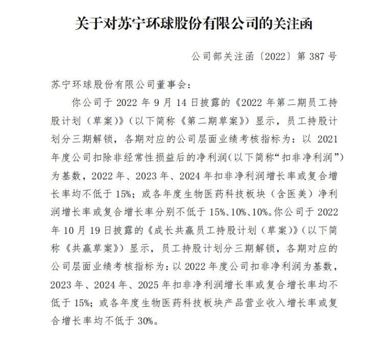深交所向苏宁环球(000718)下发关注函,要求说明公司短期内推出两期员工持股计划的原因及主要考虑;说明《2022年第二期员工持股计划(草案)》以2021年扣非后净利润为基数且生物医药板块包含医美业务,而《成长共赢员工持股计划(草案)》以2022年扣非后净利润为基数且生物医药板块未包含医美业务的主要考虑及合理性等问题。