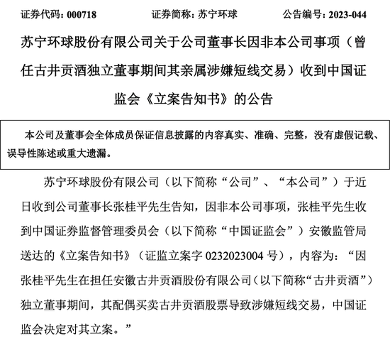 10月21日,苏宁环球股份有限公司公告(以下简称“苏宁环球”),公司于近日收到公司董事长张桂平告知,因非本公司事项,张桂平收到中国证券监督管理委员会(简称“中国证监会”)安徽监管局送达的《立案告知书》(证监立案字 0232023004 号),内容为:“因张桂平先生在担任安徽古井贡酒股份有限公司(以下简称“古井贡酒”)独立董事期间,其配偶买卖古井贡酒股票导致涉嫌短线交易,中国证监会决定对其立案。”