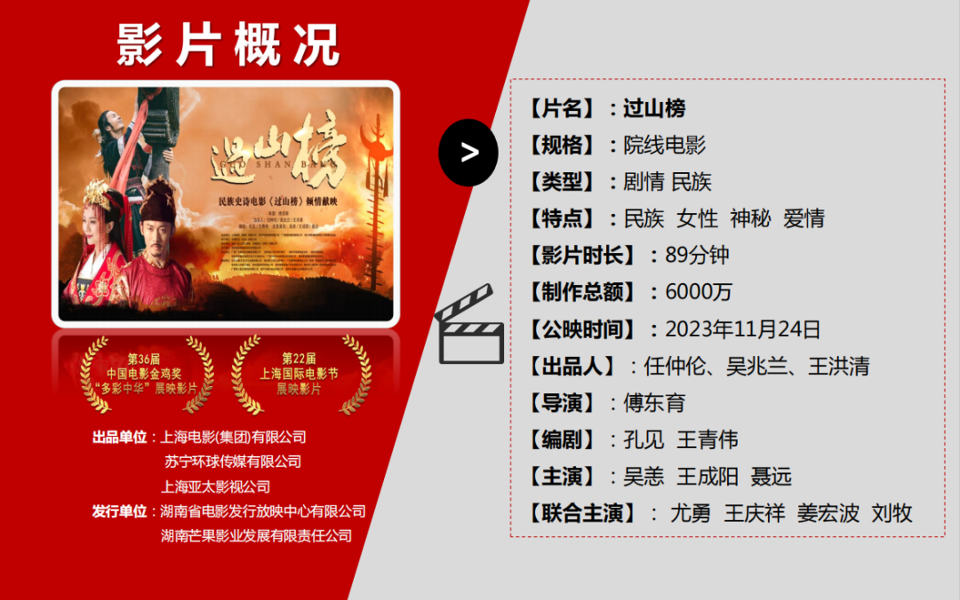 苏宁环球集团旗下苏宁环球传媒投资出品的民族史诗电影《过山榜》将于11月24日正式上映!该片由湖南省湖南省电影发行放映中心有限公司、湖南芒果影业发展有限责任公司负责全国发行,湖南楚湘影业有限责任公司联合发行。