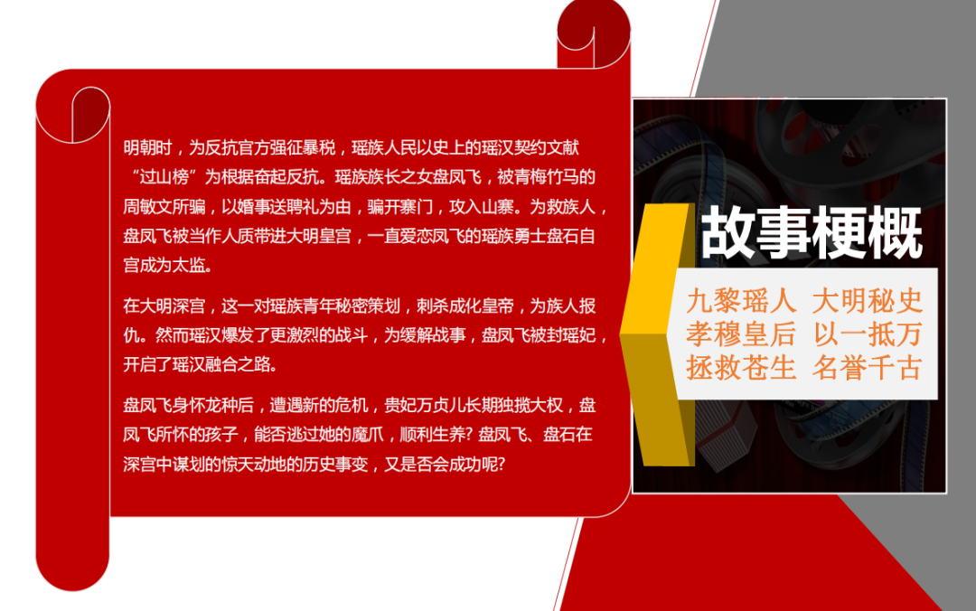 影片以瑶族民间世代传承的历史文献《过山榜》为片名,以明代孝穆皇太后(瑶妃)的历史故事和民间传说为蓝本创作拍摄,通过讲述明朝成化年间瑶族勇士盘石与族长女儿盘凤飞从被俘进宫刺杀皇帝到完成民族融合大业的故事,融合了民族团结、爱情传奇、生命理念等,原生态地呈现了历史,既有青山绿水间的刀光剑影,又有红墙碧瓦皇宫中的铁血柔情和爱恨纠缠,是一部融合爱情与战争、充满浪漫主义色彩的民族史诗级别、别具一格的新风格大片。