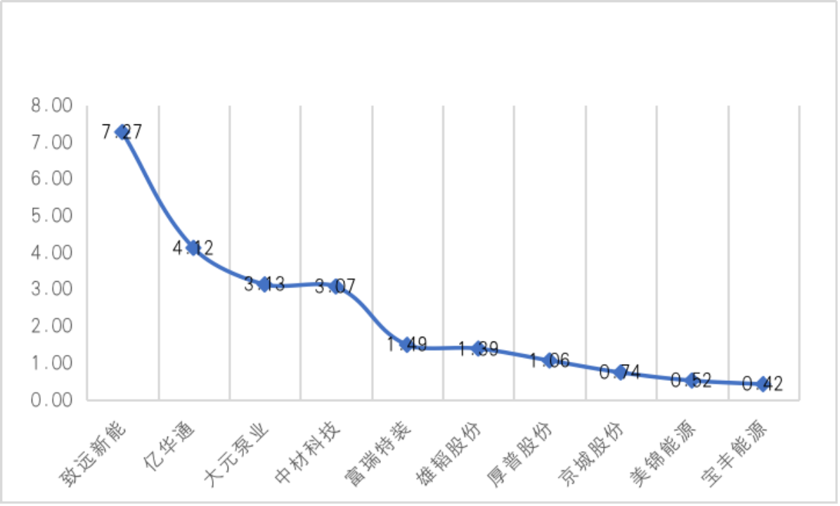 ——财务能力总体表现一般。首先,2021年美锦能源流动性及偿债能力表现一般(见图2),仅为0.52,与该赛道内的致远新能、大元泵业和亿华通有较大差距。这三家公司的偿债能力分别达到7.27、3.13和4.12,也低于该赛道内10家样本企业的均值。其次,营运能力表现良好(见图3),大元泵业排在首位,为87.14分;次之为美锦能源,达到72.38分。第三,盈利能力具有较弱的相对优势。10家样本企业平均盈利能力表现一般,宝丰能源和中材科技位居于前列,分别达到25.33分和25.29分,美锦能源以21.85分紧随其后,相比其他企业具有较弱的相对优势。第四,发展能力一般。2021年,以百分化总资产增长率衡量的发展能力为8.47,远低于致远新能的46.47分,也低于宝丰能源、厚普股份和亿华通等,但又高于富瑞特装、京城股份和中材科技等。