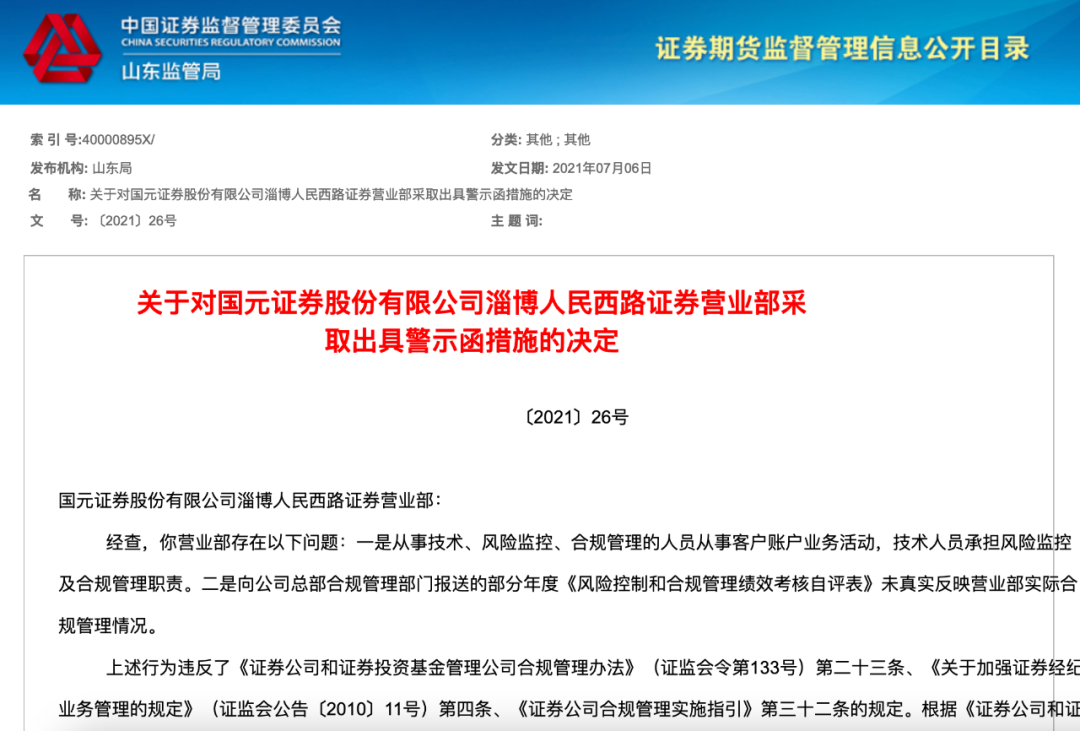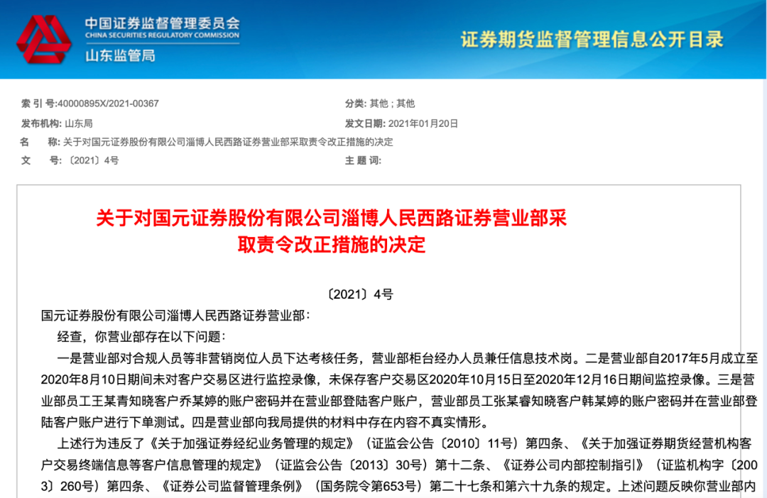 富凯IPO财经财经了解到,2021年1月20日中国证券监督管理委员会山东监管局向国元证券发布《关于对国元证券股份有限公司淄博人民西路证券营业部采取责令改正措施的决定》?,仅仅半年时间2021年07月06日国元证券淄博人民西路证券营业部收到中国证券监督管理委员会山东监管局发布《关于对国元证券股份有限公司淄博人民西路证券营业部采取出具警示函措施的决定》。