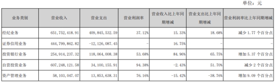 自营投资业务方面,报告期内,母公司股票、债券等证券类投资业务实现收益(投资收益、公允价值变动、利息收入等)9.01亿元,扣除卖出回购等利息支出及分摊的资金成本3.68亿元后,实现净收入5.33亿元。