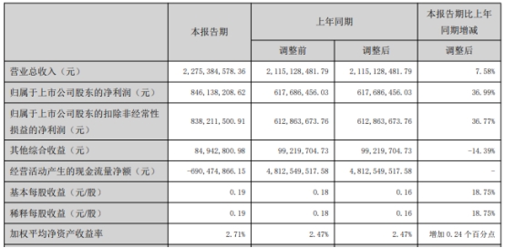 报告期内,国元证券基本每股收益为0.19元/股,比上年同期增长18.75%;加权平均净资产收益率2.71%,较上年同期增加0.24个百分点。