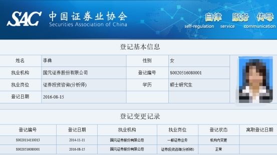 据中国证券业协会网站显示,李典于2016年8月15日在国元证券登记的执业岗位为证券投资咨询(分析师),登记状态为正常。