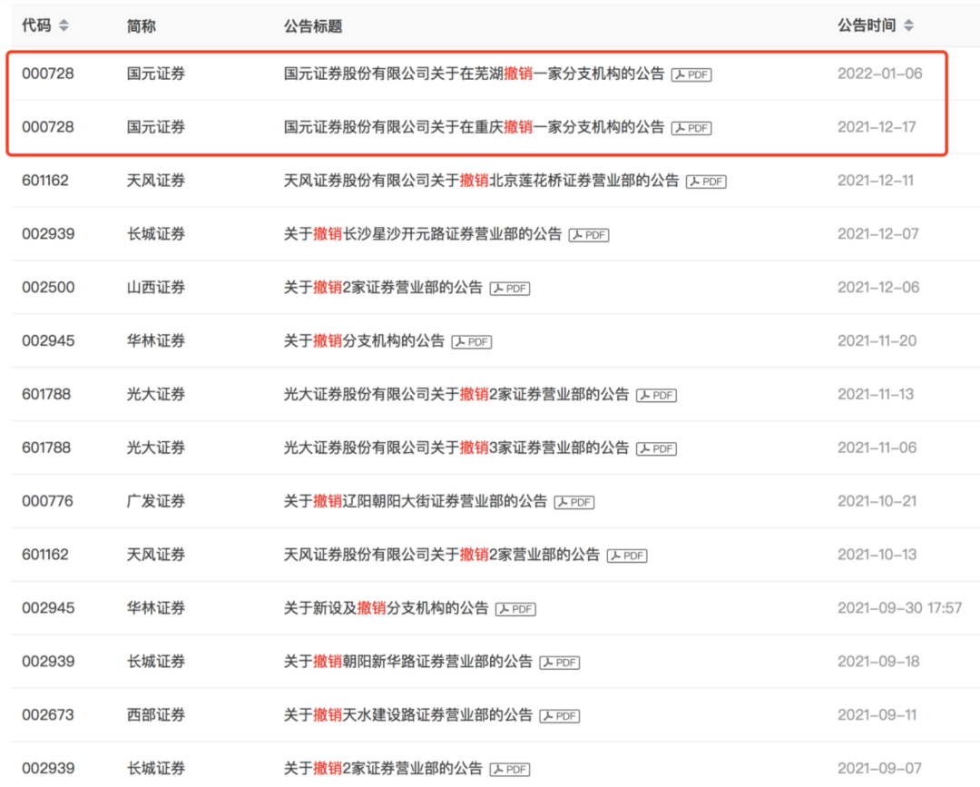 查阅公开信息可以看到,2020年以来,国元证券在“撤销”上动作频繁,相继撤销了天津、广州、成都、深圳等地的营业部或分支机构。
