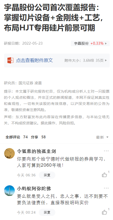 5月23日,凌晨发布了一份关于宇晶股份的研报《宇晶股份公司首次覆盖报告:掌握切片设备+金刚线+工艺,布局HJT专用硅片前景可期》。