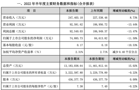 此外,截至2022年6月末,公司总资产比年初增长15.02%,主要为增加债券正回购规模扩大债权投资,以及客户证券交易结算资金增加所致;归属于上市公司股东权益比年初下降0.22%,主要因支付2021年现金分红款7.85亿元所致。
