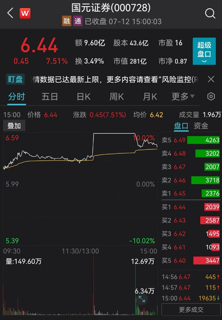 7月12日,券商板块盘中异动,国元证券一度涨停,临近尾盘涨幅收窄,券商板块收涨0.28%,国元证券收涨7.51%。