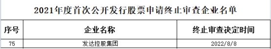 据证监会网站消息,证监会决定终止对发达控股集团股份有限公司(以下简称“发达股份”)首次公开发行股票申请的审查。
