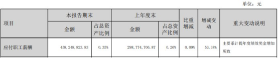截至2022年6月末,国元证券应付职工薪酬4.58亿元,上年度末为2.99亿元,较上年度末增长53.38%,主要系计提年度绩效奖金增加所致。