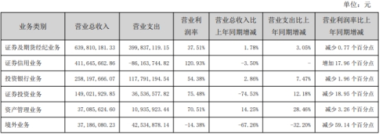 主营业务分类别来看,今年上半年,国元证券的证券及期货经纪业务实现营业收入6.40亿元,同比增长1.78%,营业利润率37.51%,比上年同期减少0.77个百分点;证券信用业务实现营业收入4.12亿元,同比减少3.50%,营业利润率120.93%,比上年同期增加17.96个百分点;投资银行业务实现营业收入2.58亿元,同比增长2.86%,营业利润率54.38%,比上年同期减少1.96个百分点;证券投资业务实现营业收入1.49亿元,同比减少74.53%,营业利润率75.48%,比上年同期减少18.95个百分点;资产管理业务实现营业收入3708.56万元,同比增长14.25%,营业利润率70.51%,比上年同期减少3.26个百分点;境外业务实现营业收入3718.61万元,同比减少67.26%,营业利润率-14.38%,比上年同期减少59.14个百分点。