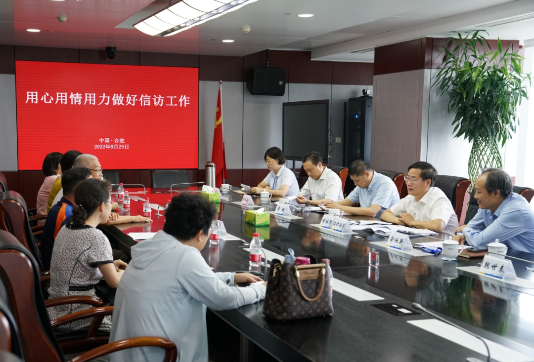 在随后的接访座谈会上,黄林沐耐心倾听、认真记录来访人员的每个问题和诉求,仔细了解有关情况,并与国元证券负责同志现场办公,认真商讨解决办法。他强调,国元证券党委要深入学习贯彻习近平总书记关于加强和改进人民信访工作的重要指示精神,认真贯彻落实《信访工作条例》,严格落实主体责任和首接首办制度,抓紧核实信访人员反映的情况,拿出务实有效解决办法,用心用情用力做好合理合法诉求的妥善化解工作。集团各级各单位领导班子要始终坚持以人民为中心的发展理念,带头开门接访、带案下访、包案化解,并从信访问题反映强烈的薄弱环节着手,切实加强工作改进提升,努力用信访工作的实际成效取信于广大干部员工,以实际行动和优异成绩迎接党的二十大胜利召开。