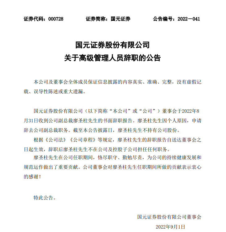 8月31日,国元证券发布公告显示,公司董事会于2022年8月31日收到副总裁廖圣柱的书面辞职报告。廖圣柱因个人原因,申请辞去公司副总裁职务。截至公告披露日,廖圣柱不持有公司股份。