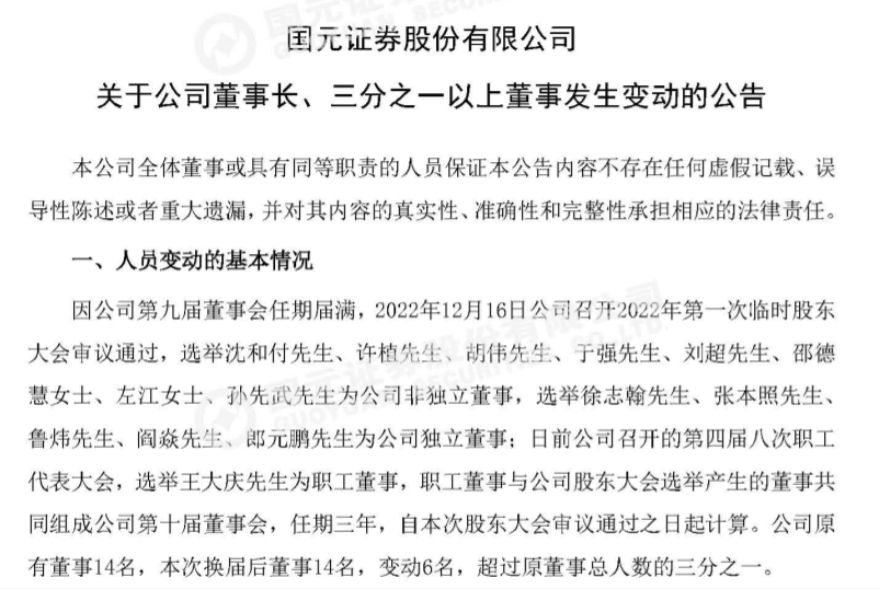 12月19日,国元证券发布一则人事调整公告,称公司第九届董事会任期届满,经日前召开临时股东大会审议通过,国元证券确定了第十届董事会成员,任期三年。