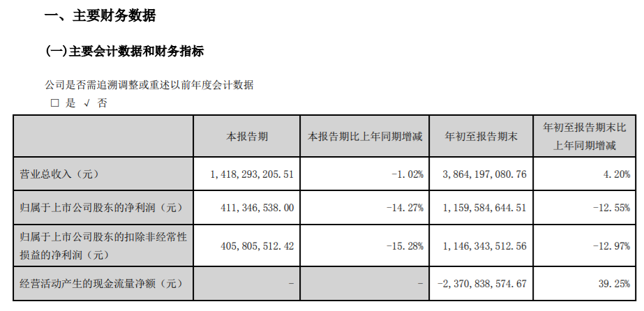 前三季度业绩承压