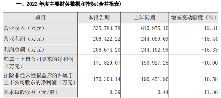 业绩方面,国元证券2022年度业绩快报显示,去年公司营收为53.58亿元,同比(与前一年同期相较)减少了12.31%;归属于上市公司股东的净利润(下称“净利润”)为17.18亿元,同比减少10%;基本每股收益为0.39元/股,同比减少了11.36%。