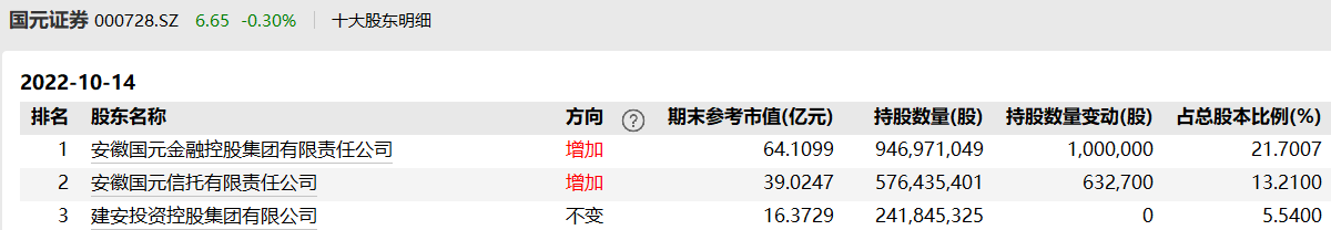 股权方面,Wind资料显示,目前国元证券持股比例超过5%的股东共有3家,分别为安徽国元金融控股集团有限责任公司、安徽国元信托有限责任公司和建安投资控股集团有限公司,持股比例分别为21.70%、13.21%、5.54%。
