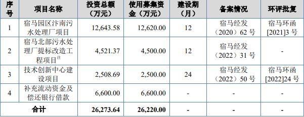 皖创环保原拟募集资金26220.00万元,分别用于宿马园区汴南污水处理厂项目、宿马北部污水处理厂提标改造工程项目、技术创新中心建设项目、补充流动资金及偿还银行借款。