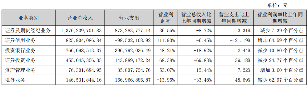 数据显示,除收入占比仅为1.42%的资管业务有增长外,其它主要业务全部下滑。其中,自营证券投资业务收入大幅下滑69.83%,投资银行业务收入下滑了18.92%,收入占比为25.76%证券及期货经纪业务下滑了8.72%。