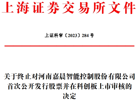 中国经济网北京5月31日讯据上交所网站昨日消息,上交所决定终止对河南嘉晨智能控制股份有限公司(以下简称“嘉晨智能”)首次公开发行股票并在科创板上市审核。