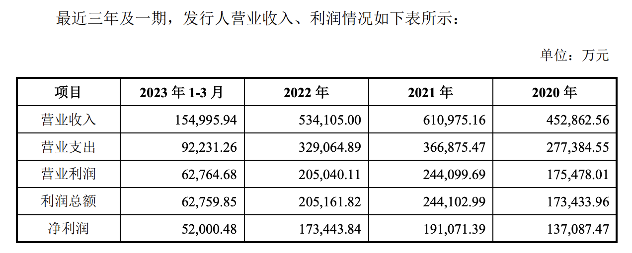 2020-2022年及2023年1-3月,公司营业收入(合并报表)分别为45.29亿元、61.10亿元、53.41亿元和15.50亿元,归属于母公司所有者的净利润分别为13.70亿元、19.09亿元、17.33亿元和5.20亿元。