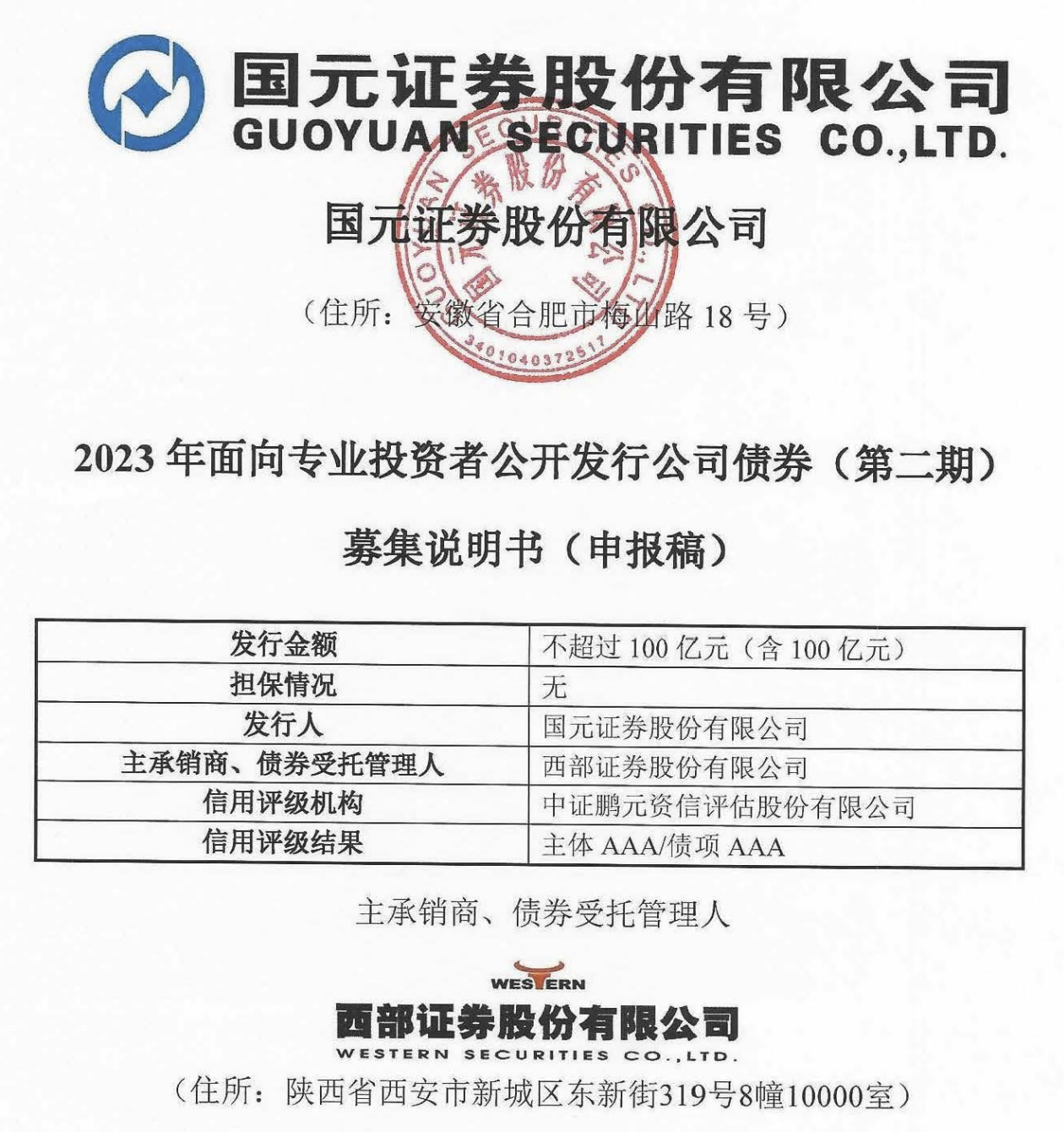 债券类别为小公募,拟发行金额100亿元,发行人为国元证券股份有限公司,承销商/管理人为西部证券股份有限公司。