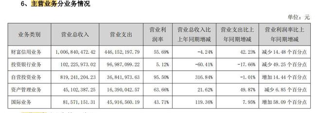 国元证券设置财富信用业务、投资银行业务、自营业务、机构业务、资产管理业务、国际业务六大板块。数据显示,自营投资业务增长最为强劲,营业总收入为8.19亿元,同比增长316.84%。