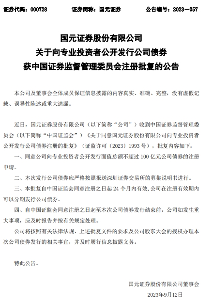 国元证券(000728.SZ)昨日公告称,近日,公司收到中国证监会《关于同意国元证券股份有限公司向专业投资者公开发行公司债券注册的批复》(证监许可〔2023〕1993号),同意公司向专业投资者公开发行面值总额不超过100亿元公司债券的注册申请。