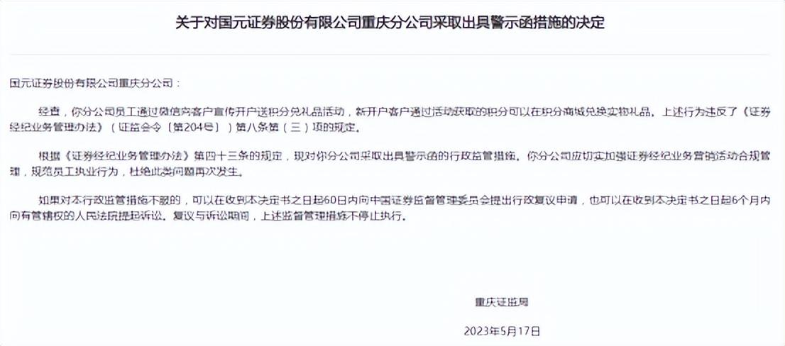 值得注意的是,今年5月17日,国元证券重庆分公司员工因存在通过微信向客户宣传开户送积分兑礼品活动,新开户客户通过活动获取的积分可以在积分商城兑换实物礼品等违规行为被重庆证监局出具警示函。