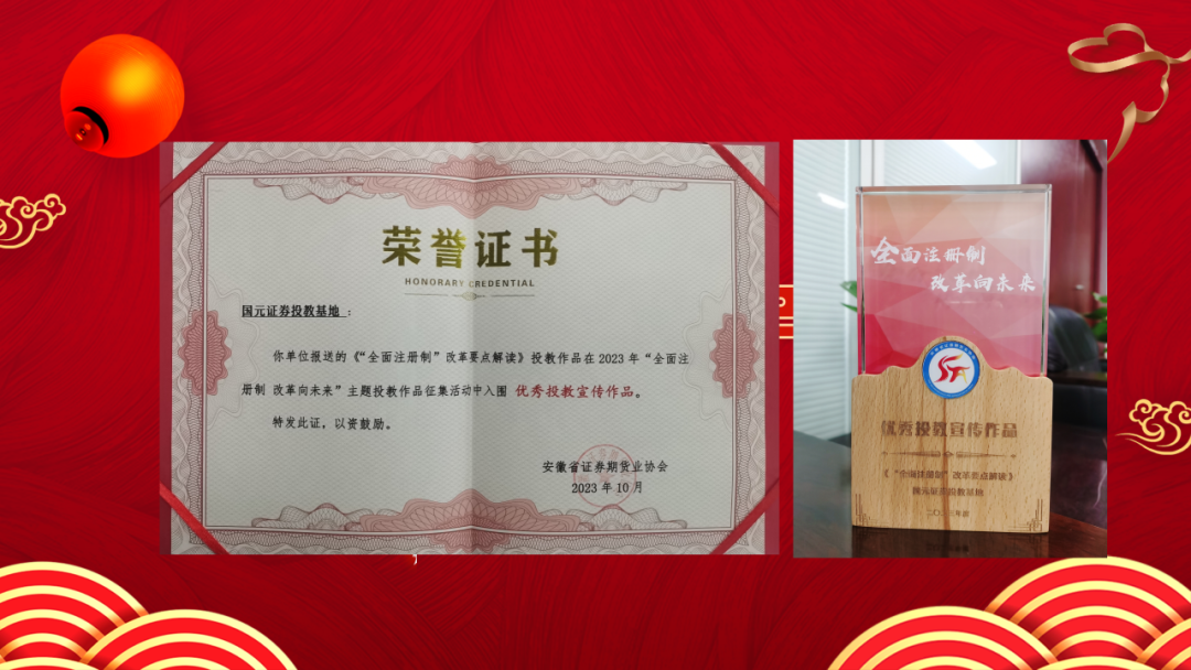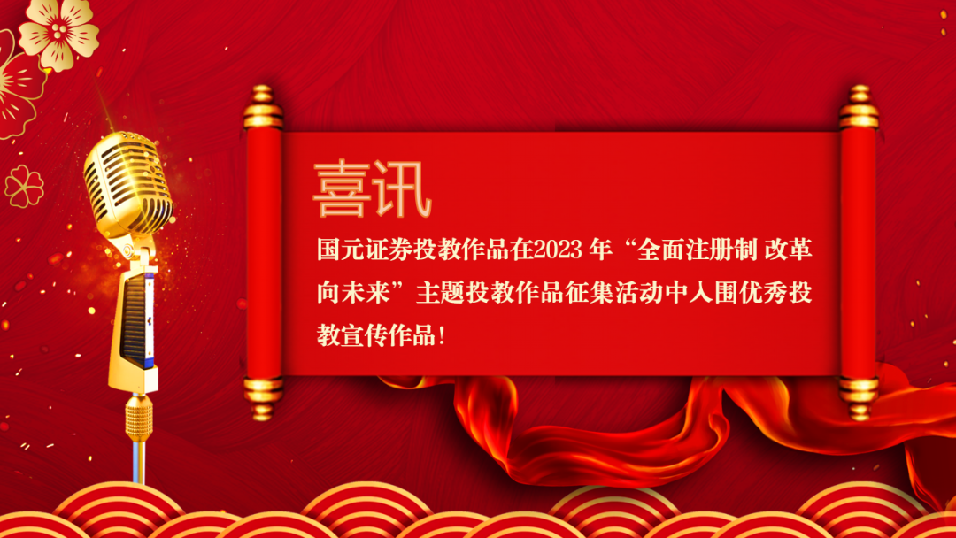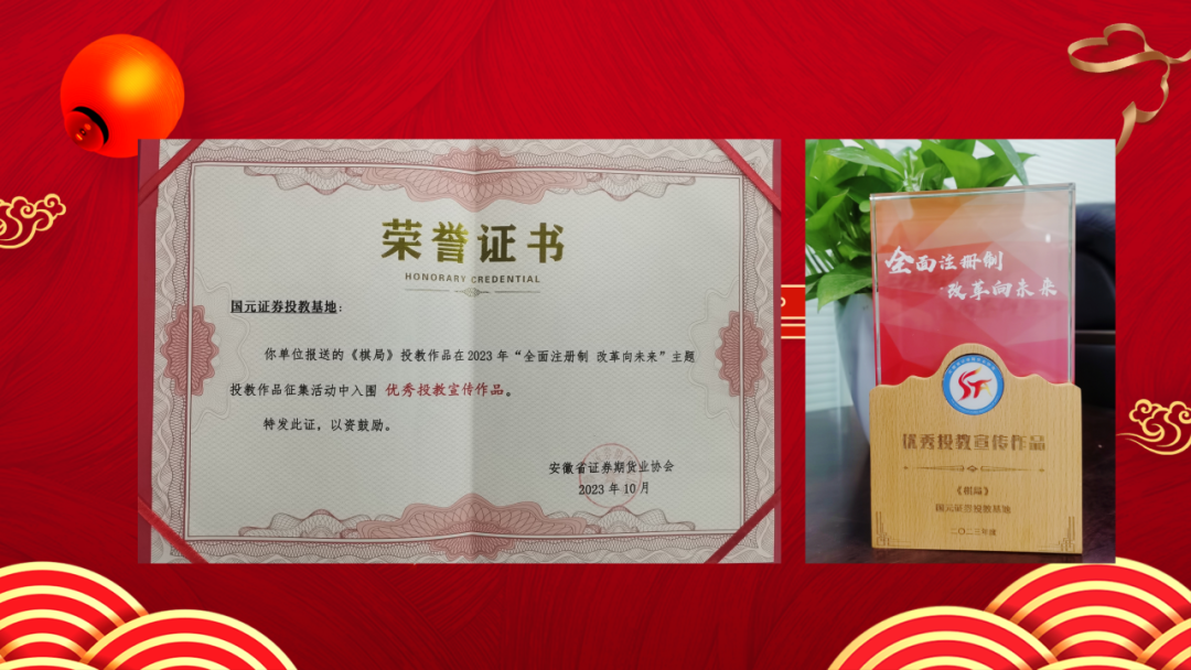 国元证券合规法务部与国元证券投教基地联合制作的《棋局》以及国元证券投教基地选送淮南分公司制作的《“全面注册制”改革要点解读》投教作品在安徽省证券期货业协会主办的2023年“全面注册制改革向未来”主题投教作品征集活动中成功入围优秀投教宣传作品!