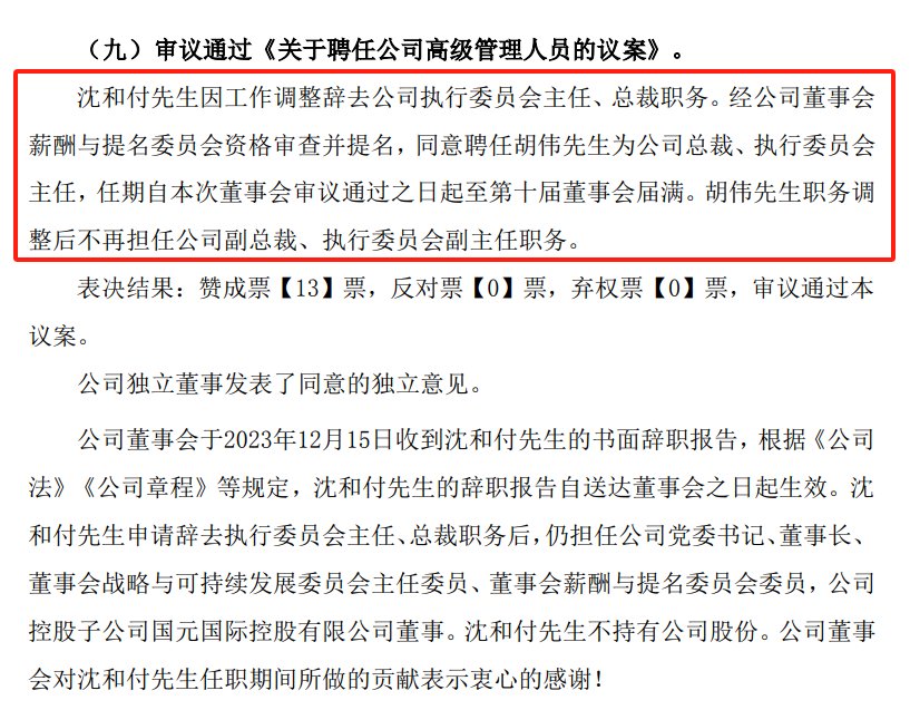 12月15日晚,公司公告,聘任胡伟为公司总裁、执行委员会主任,原董事长、执委会主任、总裁沈和付则辞去执行委员会主任、总裁职务,仍担任公司党委书记、董事长。