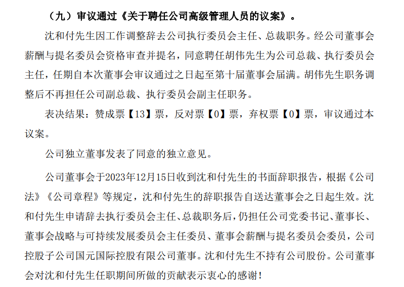 12月19日,国元证券发布《关于公司总裁发生变动的公告》。其中提及,沈和付先生因工作调整,于2023年12月15日辞去公司执行委员会主任、总裁职务,仍担任党委书记、董事长、战略与可持续发展委员会主任委员、薪酬与提名委员会委员,控股子公司国元国际控股有限公司董事。胡伟先生担任公司总裁、执行委员会主任职务。