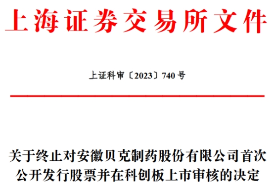 上交所网站2023年12月31日披露了关于终止对安徽贝克制药股份有限公司(以下简称“贝克制药”)首次公开发行股票并在科创板上市审核的决定。