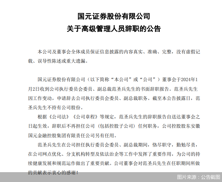 1月3日,国元证券发布公告称,于1月2日收到公司执行委员会委员、副总裁范圣兵的书面辞职报告。范圣兵因工作变动,申请辞去公司执行委员会委员、副总裁职务。根据《公司法》《公司章程》等规定,范圣兵的辞职报告自送达董事会之日起生效,辞职后不再担任国元证券(包括控股子公司)任何职务,公司控股股东安徽国元金融控股集团有限责任公司另有任用。
