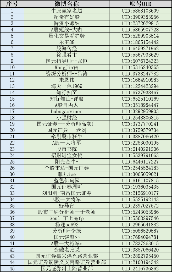 近日,国元证券股份有限公司(以下简称“我公司”)发现多名微博账号,简介中“个人信息栏”显示就职于“国元证券股份有限公司”,认证信息多为“国元证券股份有限公司技术总监、数据分析师、高级分析师、资深经理、营销经理、总监”等身份,发布内容多以宣传实时股评、政策分析观点、会员制股票学习交流群等信息。