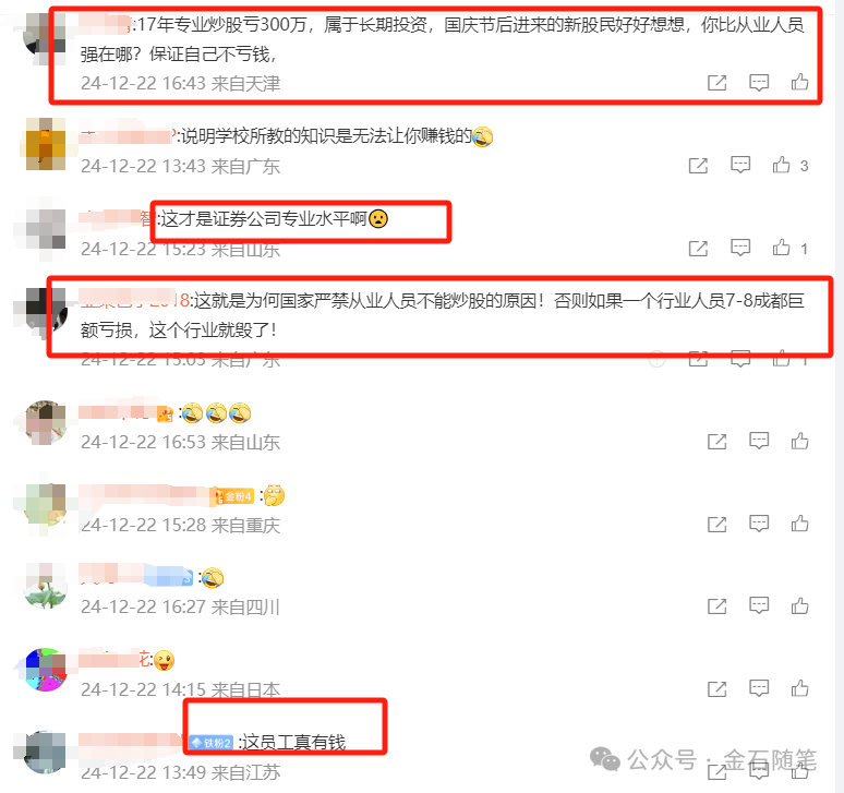 对此,有股民感慨:真悲惨,这就是一名普通股民的真实写照;也有网友评论引人深省:17年专业炒股亏300万,属于长期投资,国庆节后进来的新股民好好想想,你比从业人员强在哪?保证自己不亏钱;也有嘲讽的股民:这才是证券公司专业水平啊。