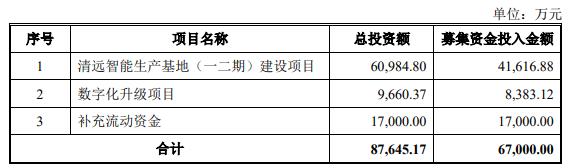 志邦家居向不特定对象发行可转换公司债券证券募集说明书(上会稿)显示,公司本次拟向不特定对象发行可转债募集资金总额(含发行费用)不超过67,000.00万元(含67,000.00万元),扣除发行费用后,拟投资于清远智能生产基地(一二期)建设项目、数字化升级项目、补充流动资金。