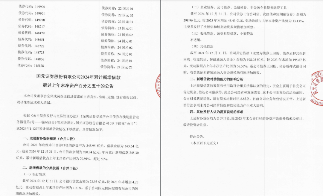 歪着头查看了这份无法直接读取的扫描件,其中载明:截至2024年12月31日,国元证券借款余额920.94亿元,年内累计新增245.30亿元;累计新增借款占上一年(2023年)净资产的比例为70.91%。