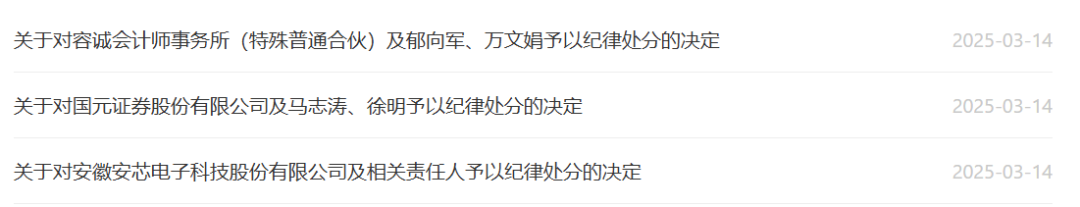 3月14日,上交所披露三份纪律处分决定书,曾申报科创板IPO的安徽安芯电子科技股份有限公司因各项违规被予以1年内不接受其提交的发行上市申请文件的纪律处分,时任董事长兼总经理汪良恩、时任财务总监方月琴被公开谴责。国元证券被通报批评,保荐代表人马志涛、徐明被予以6个月内不接受保荐代表人签字的发行上市申请文件及信息披露文件的纪律处分。容诚会计师事务所被通报批评,签字会计师郁向军、万文娟被予以6个月内不接受其签字的发行上市申请文件及信息披露文件的纪律处分。