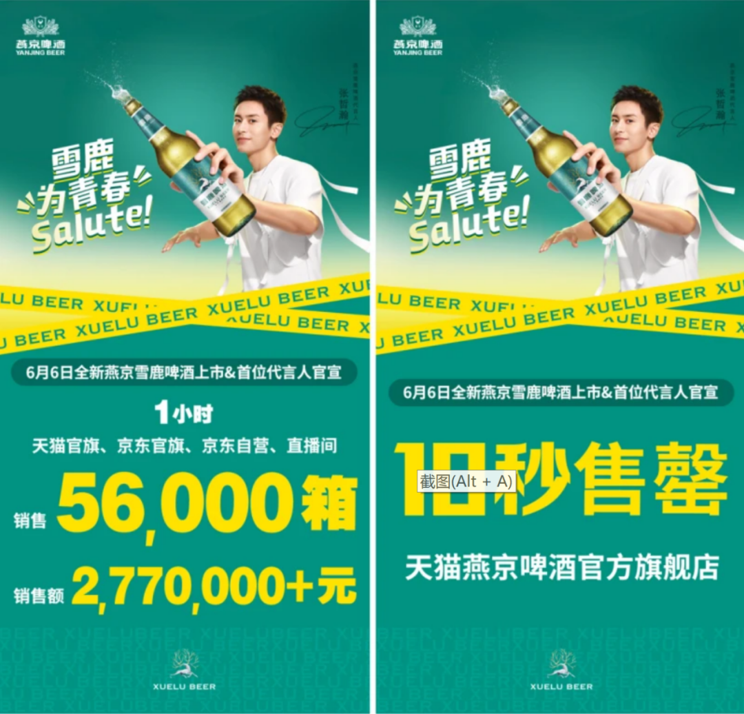 据悉,今年6月6日,燕京雪鹿啤酒官宣张哲瀚为品牌首位代言人。官宣之时,雪鹿啤酒在10秒内于天猫燕京啤酒官方旗舰店售罄。在1小时内,实现天猫、京东等全平台5.6万箱,277万元的销售业绩。