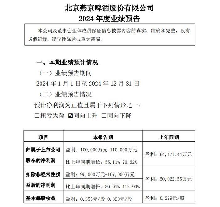 1月15日晚间,燕京啤酒(000729)发布业绩预告,预计2024年实现归属于上市公司股东的净利润在10亿元-11亿元,比上年同期增长55.1%-70.6%。
