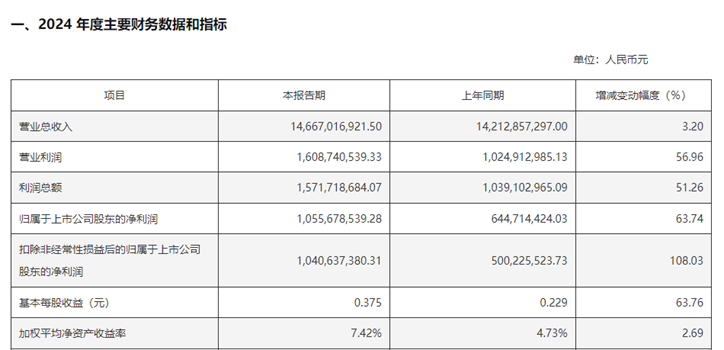 公司全年实现营收约146.67亿元,同比增长3.20%;归属于上市公司股东的净利润约10.56亿元,同比增长63.74%;扣除非经常性损益后的归属于上市公司股东的净利润约为10.41亿元,同比增长108.03%。