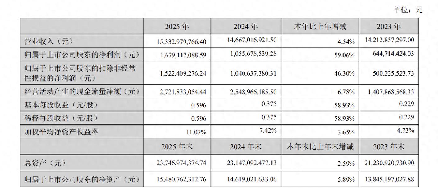 2025年,公司实现啤酒销量405.30万千升,同比增长1.21%,其中燕京U8销量90万千升,同比增长29.31%;实现营业收入153.33亿元,同比增长4.54%;营业利润23.64亿元,同比增长46.97%;利润总额23.70亿元,同比增长50.77%;实现归属于上市公司股东的净利润16.79亿元,同比增长59.06%。营收、利润等主要经济指标创历史新高。