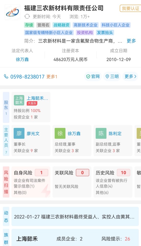 据企查查,福建三农新材料有限责任公司于2010年12月9日成立,法人徐万鑫,注册资本4.862亿元,经营范围为合成材料制造;有机化学原料制造等,由黄海宸持股95%的上海懿禾资产管理有限公司全资持有。无对外投资。